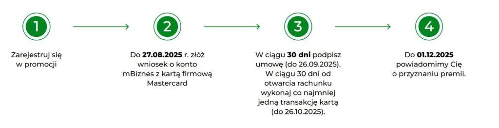👤 Kto może wziąć udział? Udział w promocji może wziąć osoba pełnoletnia, zamieszkała w Polsce, prowadząca działalność gospodarczą lub osoba chcąca założyć działalność wraz z kontem firmowym. Wykluczeni są obecni klienci mBanku (dot. kont firmowych, czyli przedsiębiorca który posiada aktualnie jakikolwiek aktywny rachunek firmowy w mBanku dla danego numeru NIP. Nie wyklucza Cię posiadanie konta osobistego lub kredytu w tym banku.