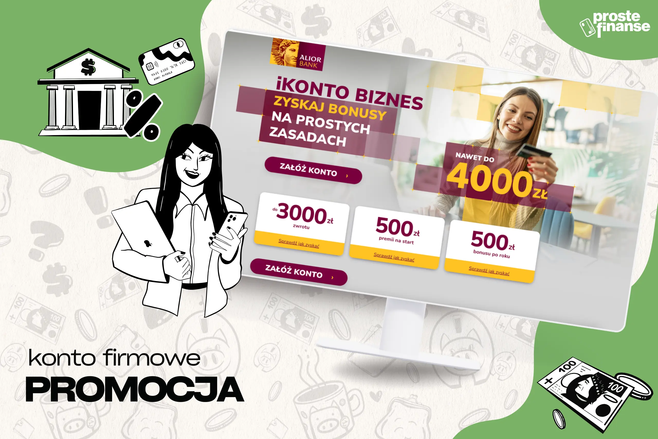 Ikona witryny - rysunkowa postać z symbolem karty kredytowej i monetW Alior Banku na nowych klientów czeka wyjątkowa okazja – iKonto Biznes z bonusem nawet do kilku tysięcy złotych. W ramach promocji bankowej możesz otrzymać m.in.: 400 zł na start, do 3000 zł moneyback za płatności kartą wydaną do konta i/lub Blikiem a także 500 zł bonusu za rok prowadzenia konta!