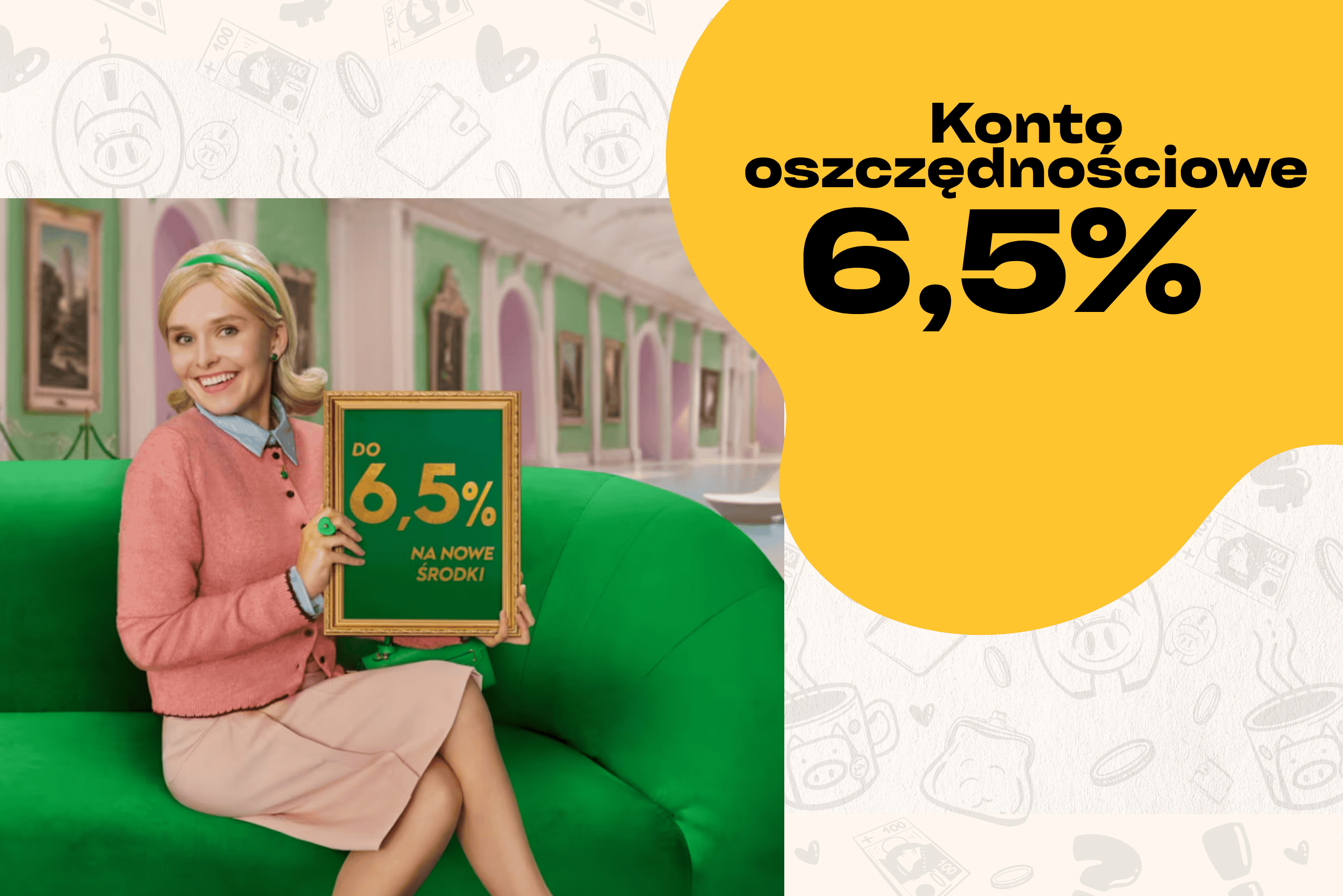Oprocentowanie: do 6,5% w skali roku na koncie oszczędnościowym na 2 miesiące (jeśli dopiero zakładasz konto oszczędnościowe + osobiste), do 50 000 zł i 4,5% dla nadwyżki od 50 000 zł do 400 000 zł